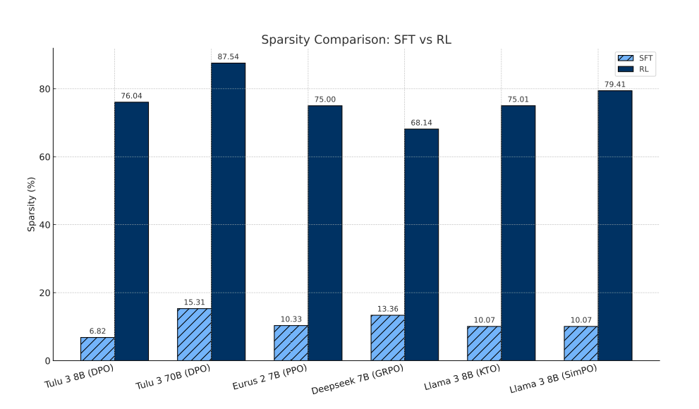 - Training dynamics of SFT and RL: We were the first to empirically show that RL causes sparse parameter updates to a base LLM. For eg. when training DeepSeek R1 Zero from DeepSeek V3 base, 86% weights were never updated.TweetPaperCode